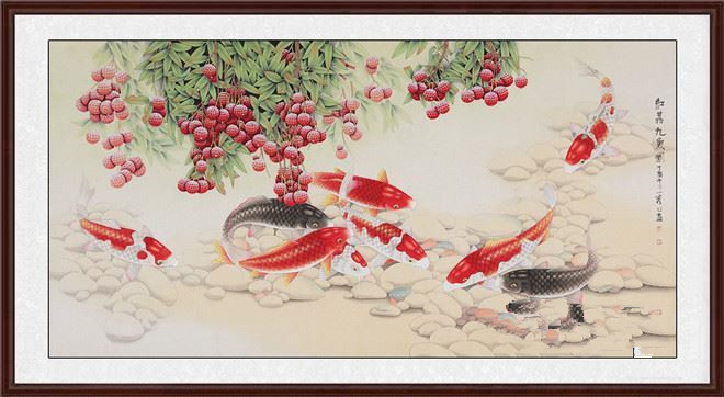荔枝形態(tài)優(yōu)美,四季常綠,象征欣欣向榮;生命力強,可生長百年以上,象征國家和人民事業(yè)蒸蒸日上,長盛不衰;人民群眾健康長壽,寓意吉祥。圖中“魚”的發(fā)音與“余”是同音,代表年年有余?!磅帯钡陌l(fā)音與“利”相同,所以鯉魚也用來象征生意中收益和盈利。由此觀之,九魚圖寓意著財源滾滾、年年有余、長長久久,在家中掛有這樣一幅字畫,有招財聚財之效果。