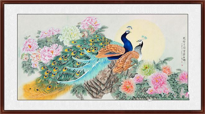 整個畫面清新淡雅,溫暖宜人的,圖中孔雀光彩艷人,絢麗無緣。自背至尾,有五色金翠閃閃發(fā)光的圓紋,相繞似銅錢,稱之為眼圈,娉婷悅目,美不盡言??兹甘菣鄤莸拇?,吉祥的象征;牡丹的卓約風姿、雍容華貴代表了盛世年華的富足和繁盛,孔雀展屛與怒放的牡丹相映成彰,孔雀屬陽鳥,百無禁忌,掛在家中可化煞鎮(zhèn)宅,光彩奪目,富貴天成。