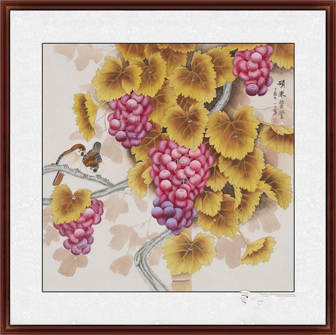 畫家以精致的筆法生動地描繪出葡萄樹的風姿,那片片葉子灑脫飄逸,把晶瑩的葡萄映襯的更加誘人,畫中葡萄晶瑩剔透,兩只鳥兒停站在葡萄樹上,更是為畫面增添了許多的生機,富有情趣,葡萄是花鳥畫的常見題材,象征著碩果累累,寓意著多子多福,不僅適合家居餐廳、臥室等場所裝飾懸掛,而且也適合結婚生子的禮品。