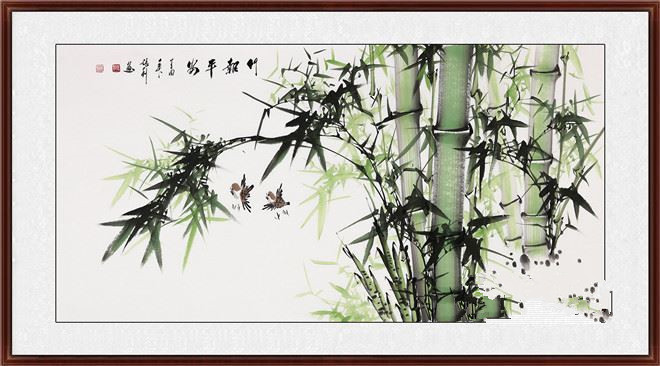 正映入眼簾的是幾只粗壯而茂盛的竹子,墨綠色的竹子粗壯而有節(jié),象征著君子有節(jié)操的美好寓意,同時竹子粗細不同展現(xiàn)了不同的墨竹姿態(tài),而四周的竹葉繁茂富有生機,竹葉疏密有致,虛實相間更有韻味!竹是中國美德的物質載體,是君子的象征,為無數(shù)仁人志士喜愛,古今文人墨客對竹充滿了贊美,留下了大量的詠竹詩和竹畫。中國人咀早的竹情節(jié)可以追溯到魏晉時期,之后,竹從一種文化意義演變到了一種民俗的意象,例如“竹報平安”常用來祝福平安吉祥。