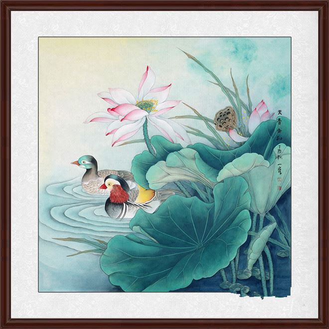 和和美美,如意吉祥,恩愛白頭,這些都是賦予鴛鴦的美好寓意。荷花盛開,還有一個蓮蓬格外的突出,這就表現(xiàn)了畫作的高超技術,蓬頭描繪的特別逼真。在碩大的荷葉下面,游出來了兩只鴛鴦,恩愛有佳,這幅斗方畫掛在臥室,那真是美妙絕倫啊,如果是夫妻雙方的臥室,還可以寓意夫妻和睦,幸福生活呢。