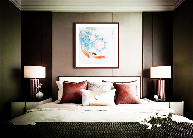 臥室床頭懸掛一幅花鳥畫作品呈現(xiàn)栩栩如生、雅俗共賞,得到廣大收藏家和書畫愛好者的賞識,起到畫龍點睛、錦上添花之效。如象征富貴榮華的牡丹花畫,象征年年有余的九魚圖等吉祥圖案都是不錯的選擇,隨重慶美信裝飾公司重慶裝飾公司一起來欣賞幾幅精品的床頭掛畫吧: