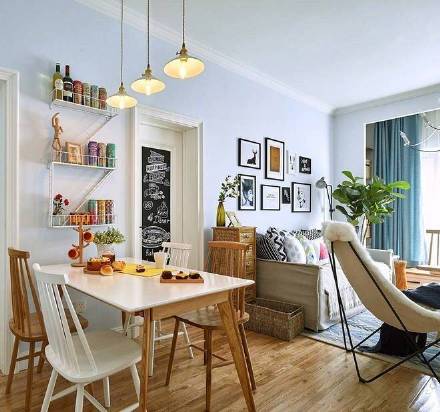 客廳的造型對設計師和業(yè)主來說,是一種大膽的嘗試。電視墻、吊頂和地板簡約到了極致,純粹無雕飾的設計讓人注目于生活本質的美好。復古磚墻和湖藍色調的點綴,增加了獨特的個性元素。